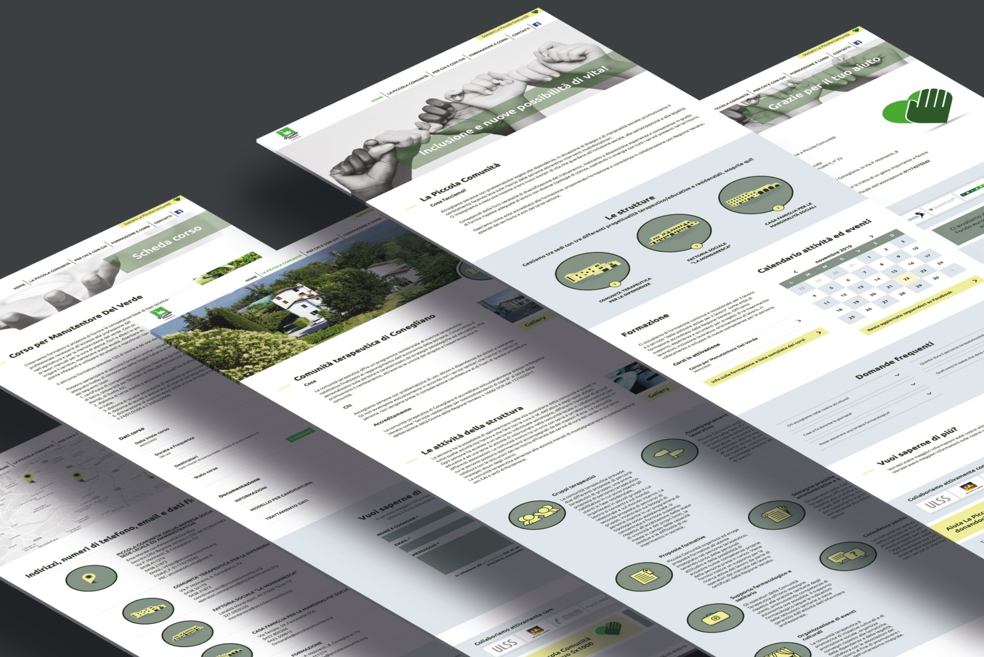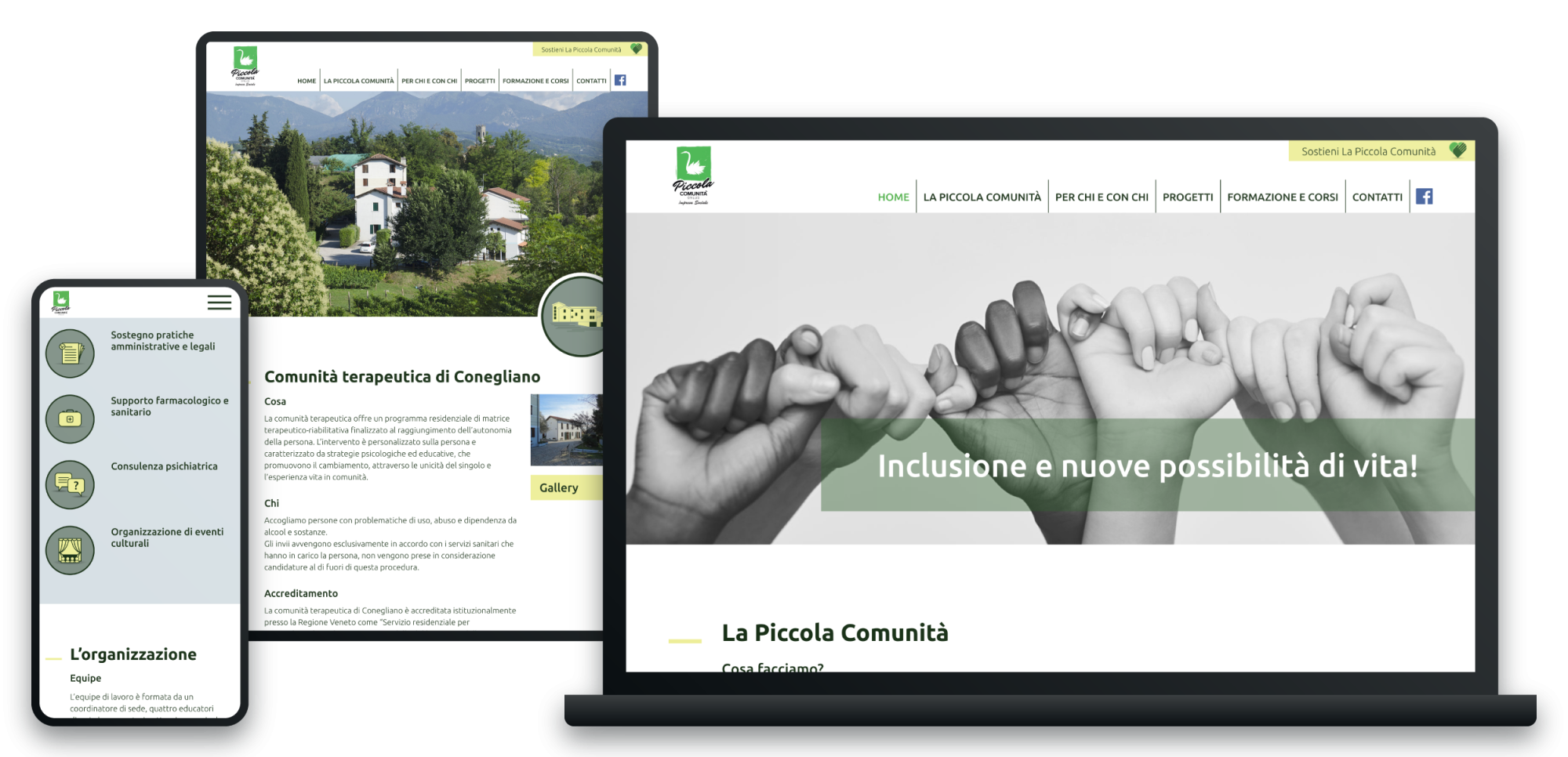 La Piccola Comunità nasce nel 1973 a Conegliano e accoglie persone ai margini, in particolare consumatori di sostanze per progetti di disintossicazione e persone che vivono delle storie di disagio psico-sociale. Attualmente gestisce tre sedi con tre diverse progettualità terapeutico-educative-residenziali, con una capienza di 90 posti.